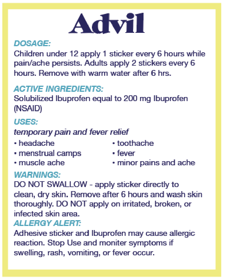 Swallowing pills can be difficult for many users, and even smaller options like Advil Liquid Gels Minis can create confusion around proper dosage and portability. This mock project—developed for an information design class and not affiliated with Advil—reimagines the product as a transdermal pain relief patch, offering a more intuitive and accessible alternative.
