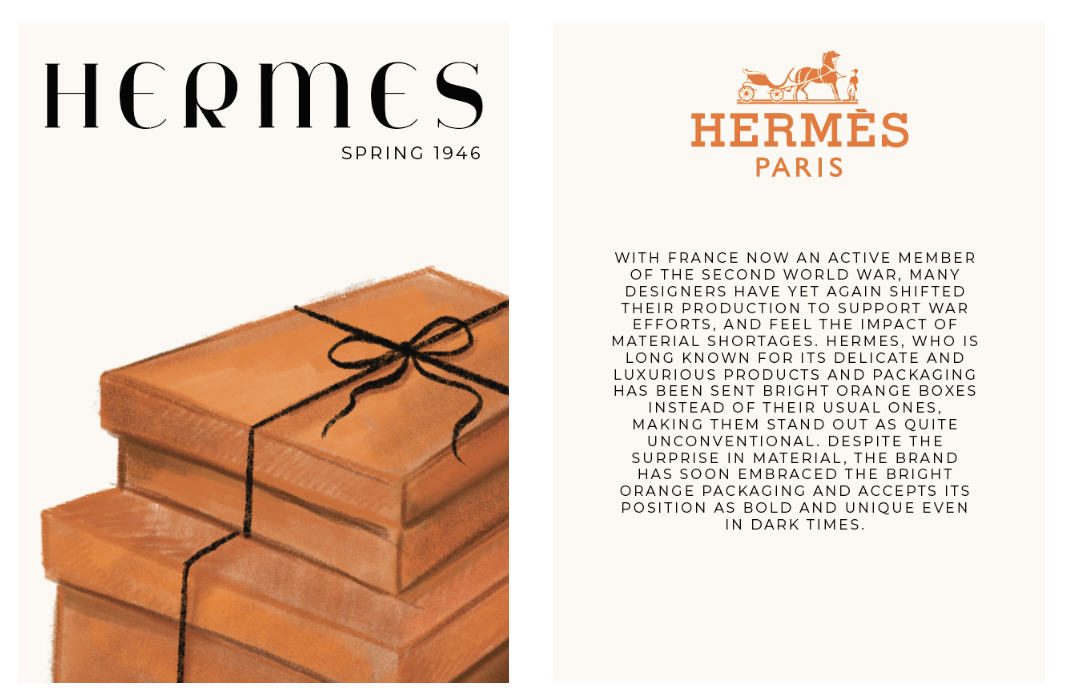 This mock brand project reimagines ephemera—short-lived printed items rooted in the Greek word “ephemeros,” meaning “lasting only a day”—as lasting expressions of identity for Hermès. Drawing from the brand’s history, the work explores how small collectibles like packaging and keepsakes can reflect cultural moments and consumer behavior.