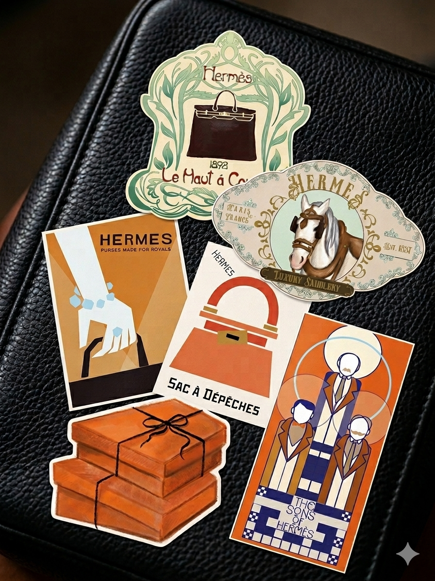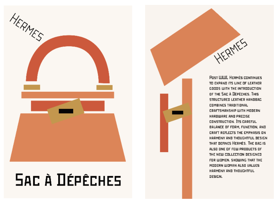 By combining the novelty of ephemera with distinct design eras, the project applies period-specific typography, visual elements, and compositions to reinterpret Hermès’ legacy. The sticker series, in particular, functions not only as an ephemeral item but also as a nod to Jane Birkin, whose use of stickers on her handbag reflected her political activism—similarly, these designs communicate broader messages while informing viewers about historical design movements.