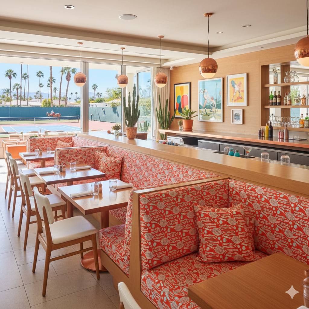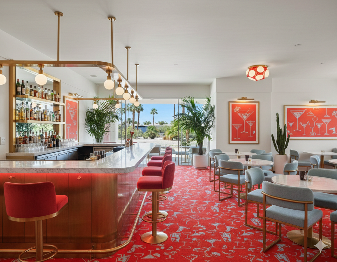 This project features a series of original illustrated patterns inspired by the vibrant spirit of Palm Springs—from iconic bougainvillea to tennis and polo, and the glamorous Old Hollywood bars and restaurants. Designed to complement Mid-Century Modern architecture, these patterns bring a modern, playful energy to 3D spaces while celebrating the city’s timeless aesthetic.