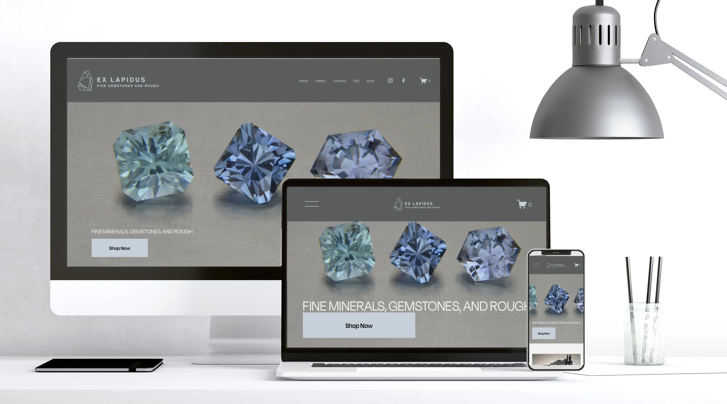This project includes the creation of the original logo, brand identity, website, and marketing materials for Ex Lapidus Gemstones, an emerging Southern California lapidary brand, featuring a hand-illustrated logo that blends the refined elegance of contemporary gemstones with the organic form of a natural crystal to reflect craftsmanship, earth connection, and artisanal beauty.